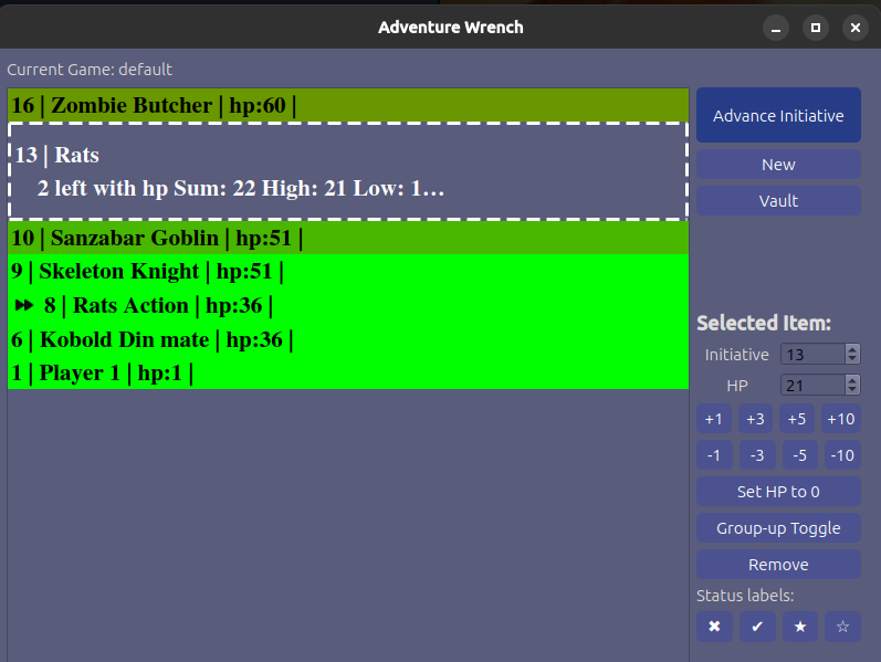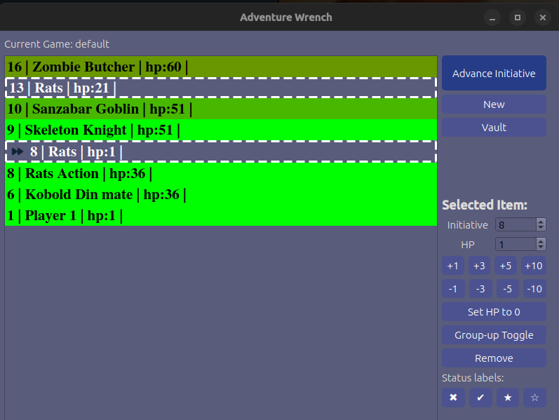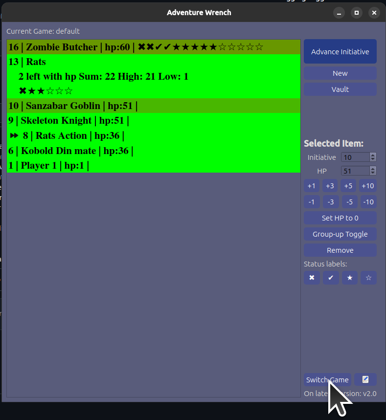 Notice how the turn order indicator. The >> arrows stayed in the right position? Neat. The Group-Up button only works on things with the same name, and it does smash stat-sheets together. So just be aware making heavy use of this feature may erase or change data in the stat blocks if you have been modifying them.