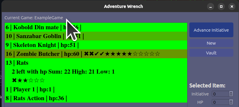 When you click on “Vault” you get a list of items that can be copied or deleted from the Initiative Tracker. Using the “Copy to” and “Erase from” buttons.