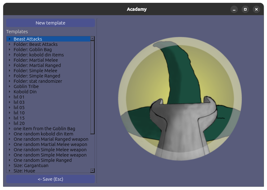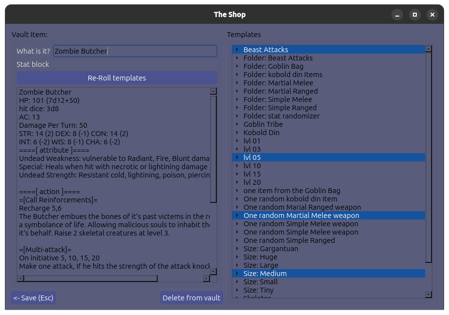 - Lastly hit the re-roll templates to re-generate new random stat-blocks until you find stuff you like. (Or directly selecting what you want out of a folder in the templates area)
